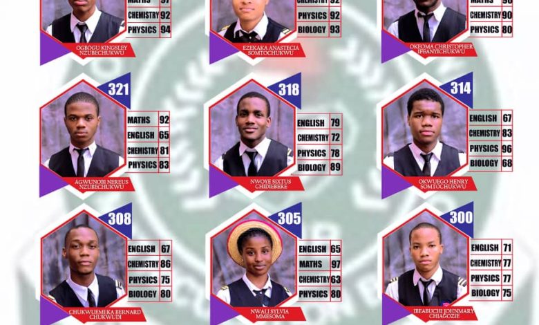 The 10, dubbed “Our Golden Eagles” by the school, are led by Kingsley Nzubechukwu Ogbogu with a belter performance of 353 marks, 18 short of the national highest overall scorer David Kikisoka Adogbo who scored 371 marks. Ogbogu who is among the highest scorers in the Southeast is closely followed by Anastasia Somtochukwu Ezekaka with 346 marks. Others are Christopher Ifeanyichukwu Okeoma 330, Nereus Nzubechukwu Agwunobi 321, Sixtus Chidiebere Nwoye 318, Henry Somtochukwu Okwuego 314, Bernard Chukwudi Chukwuemeka 308, Sylvia Mmesoma Nwali 305, John Mary Chiagozie Ibeabuchi 300 and Marvis Chijindu Lebechi 300.